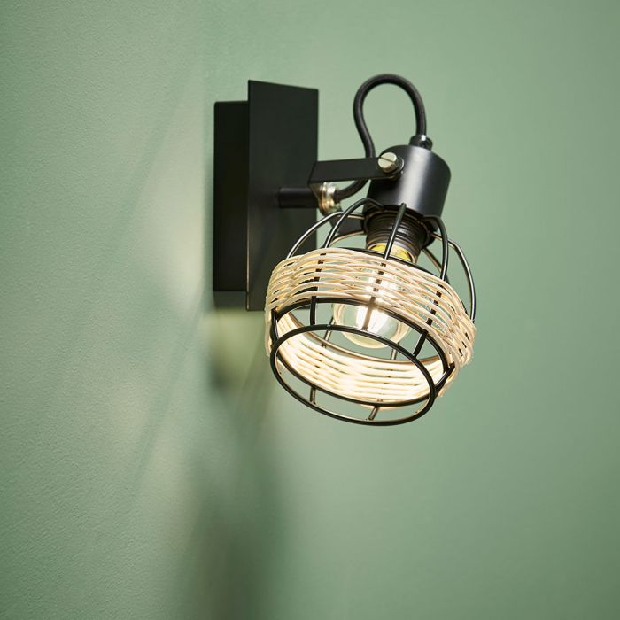 Aplique "Cyrus" de metal negro y ratán 1 pantalla - 35366