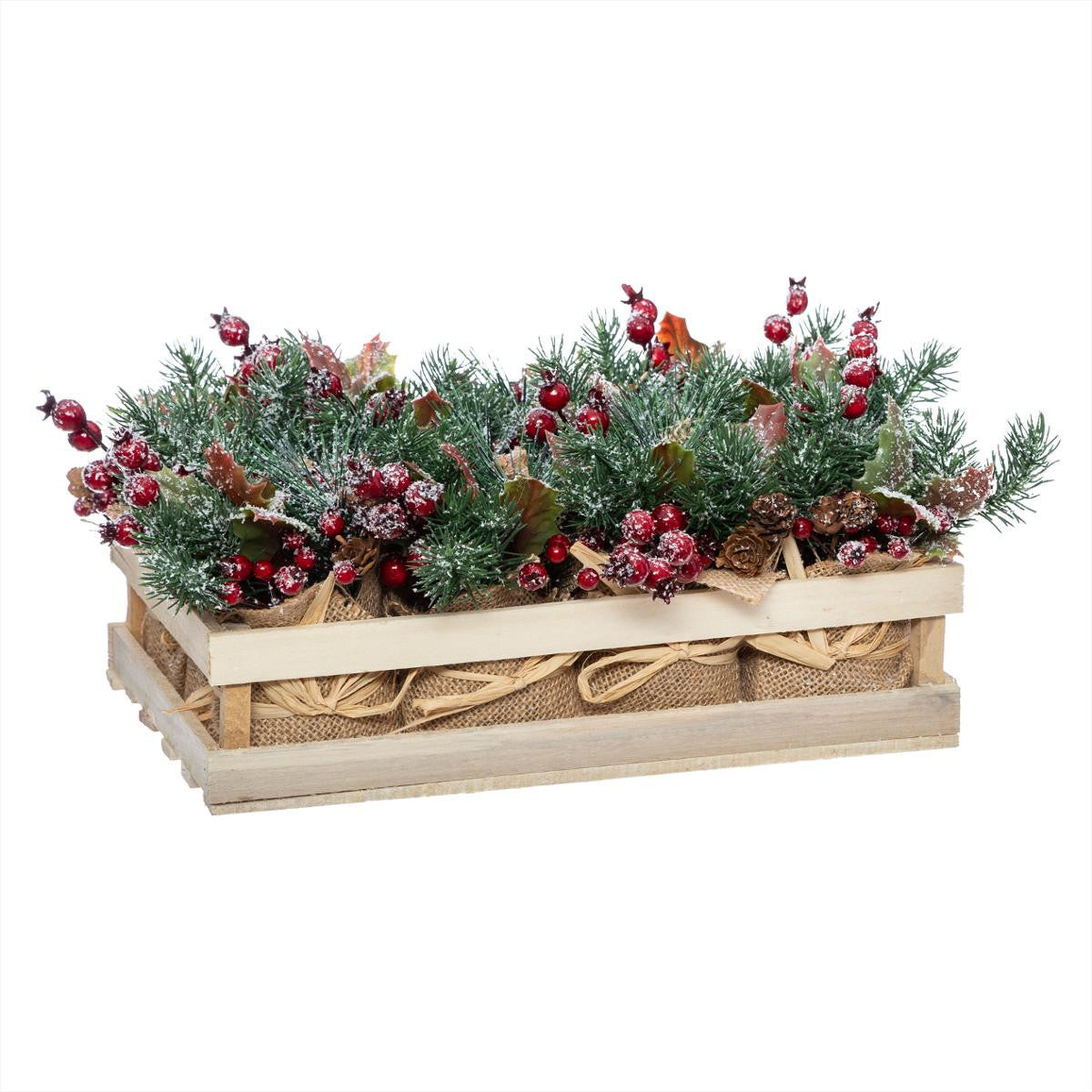 Arreglo navideño "Frutos rojos" y ramas verdes cubiertas de nieve macetas de yute - 169847
