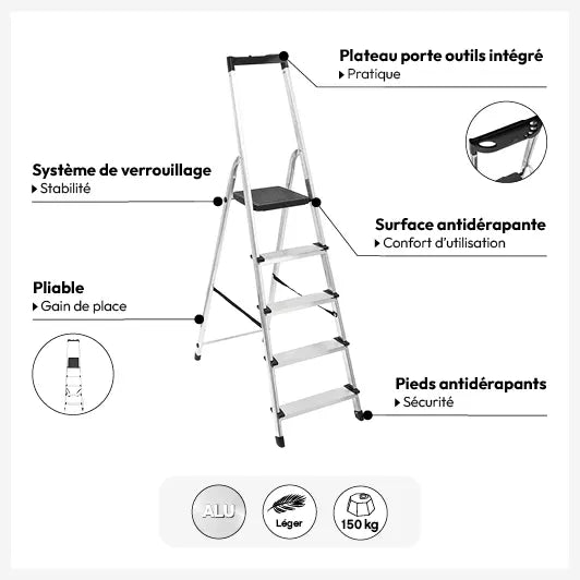Escalera plegable de aluminio de 5 peldaños A173cm - 164620