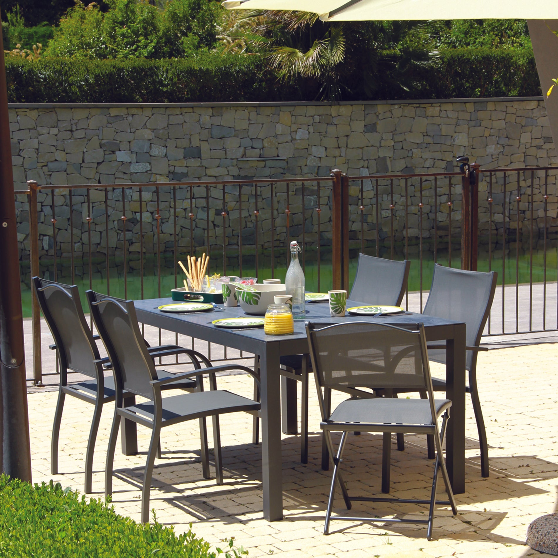 Estructura de aluminio con tratamiento epoxi gris grafito Sobre de cristal templado acabado "cerámica" efecto granito gris. Número de cubiertos... Leer más...