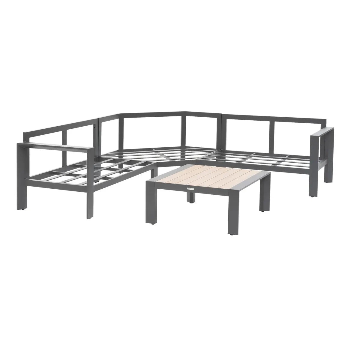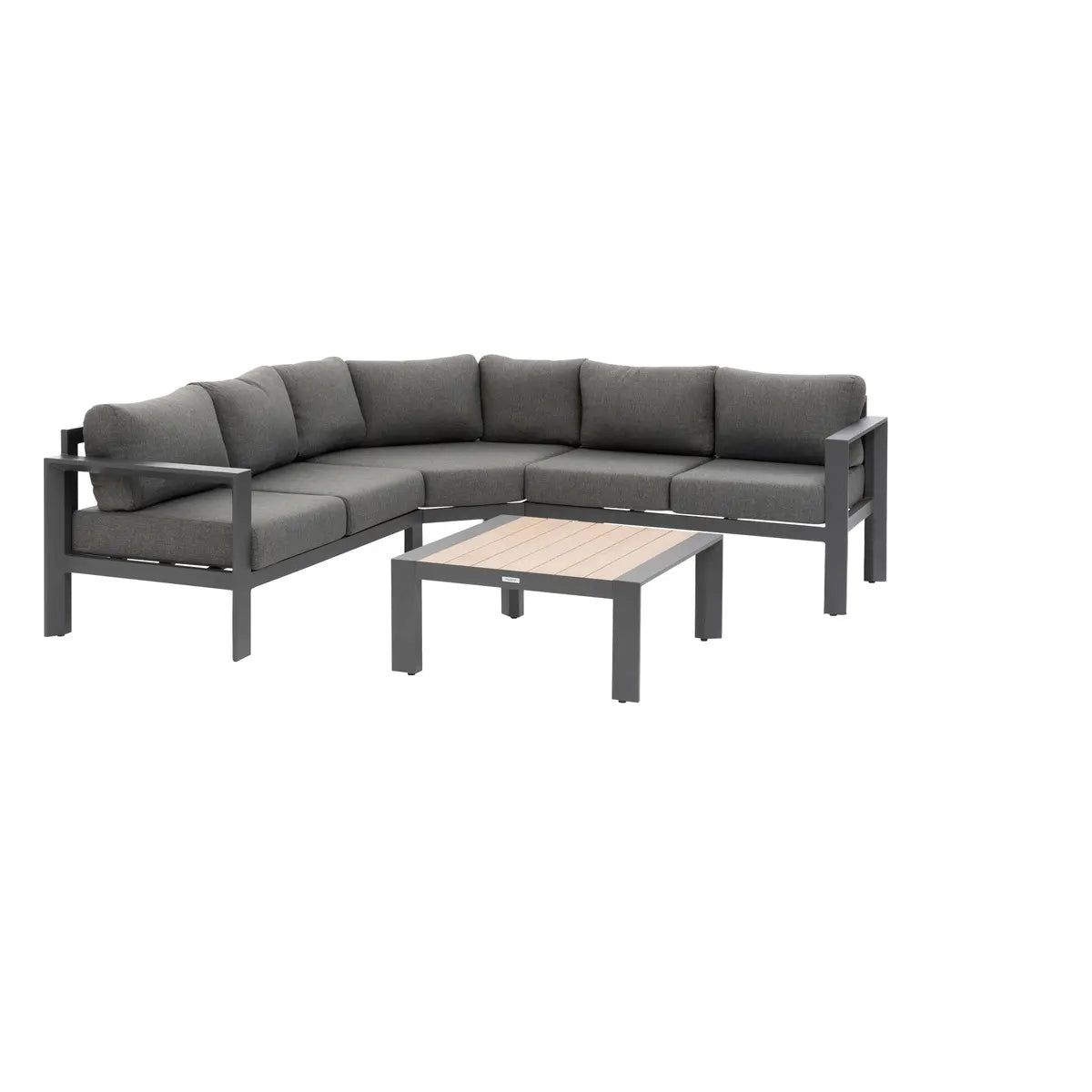 Formado por un sofá de esquina diseñado para 5 personas y una mesa de centro cuadrada, el salón "ÉVASION" es una creación de Hespéride disponible en varios colores. El conjunto está fabricado con una estructura de aluminio teñido y la mesa de centro presenta un tablero con lamas.