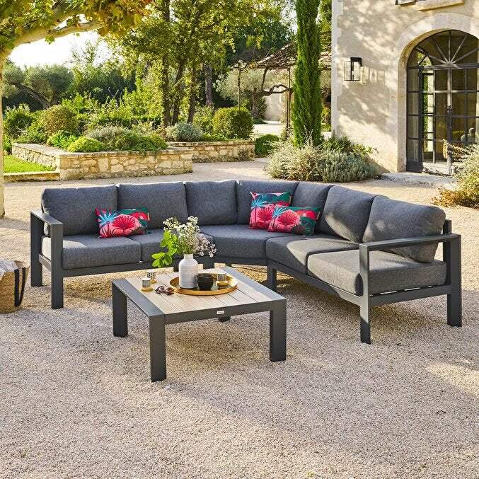 Decorado con cojines gruesos de tela repelente al agua, el sofá albergará a tus invitados para momentos de relajación en los días soleados. Colocado sobre una alfombra exterior y protegido por una sombrilla desplazada, tu salón de jardín alcanzará toda su expresión cuando lo ilumines con luces exteriores.