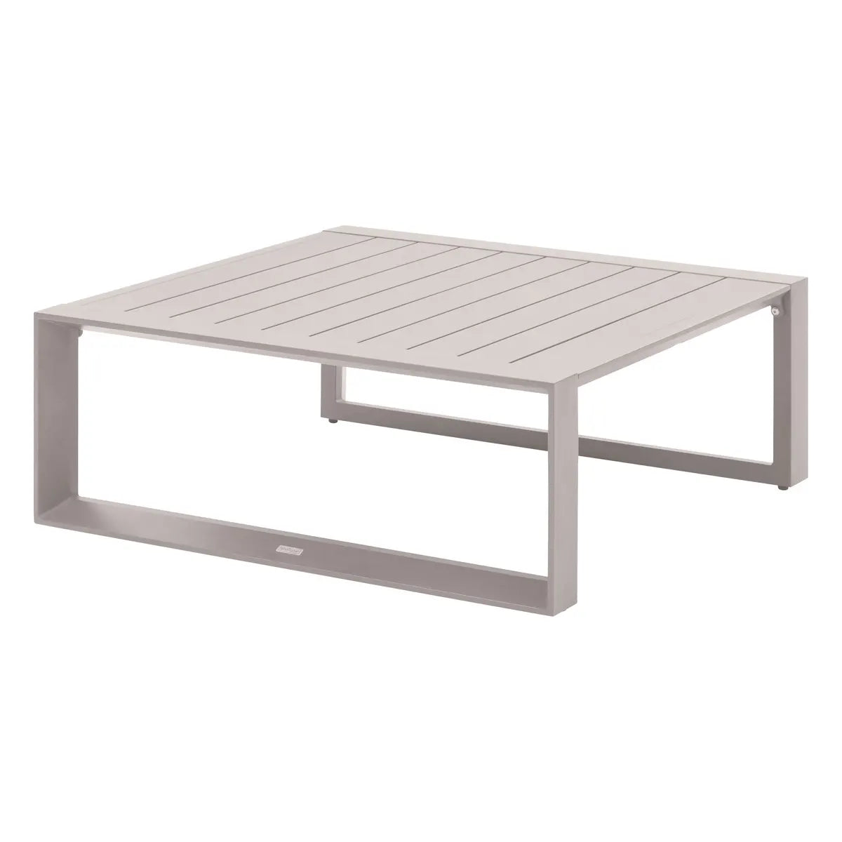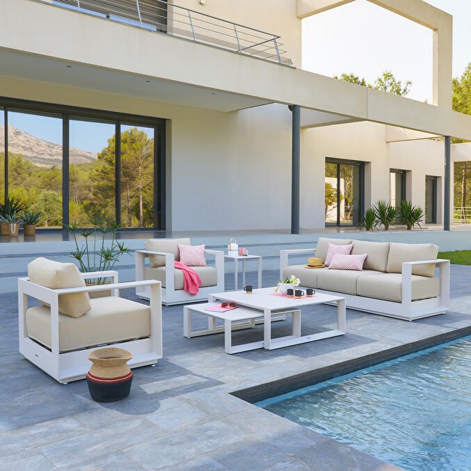 Fabricado en aluminio tintado, el conjunto "ALLURE" ofrece cómodos asientos para 5 personas, distribuidos en un sofá de 3 plazas con pliegues, con cojines que reflejan el agua. Las mesas nido y una mesa auxiliar ajustable están equipadas con patas ajustables para adaptarse a las irregularidades del suelo.