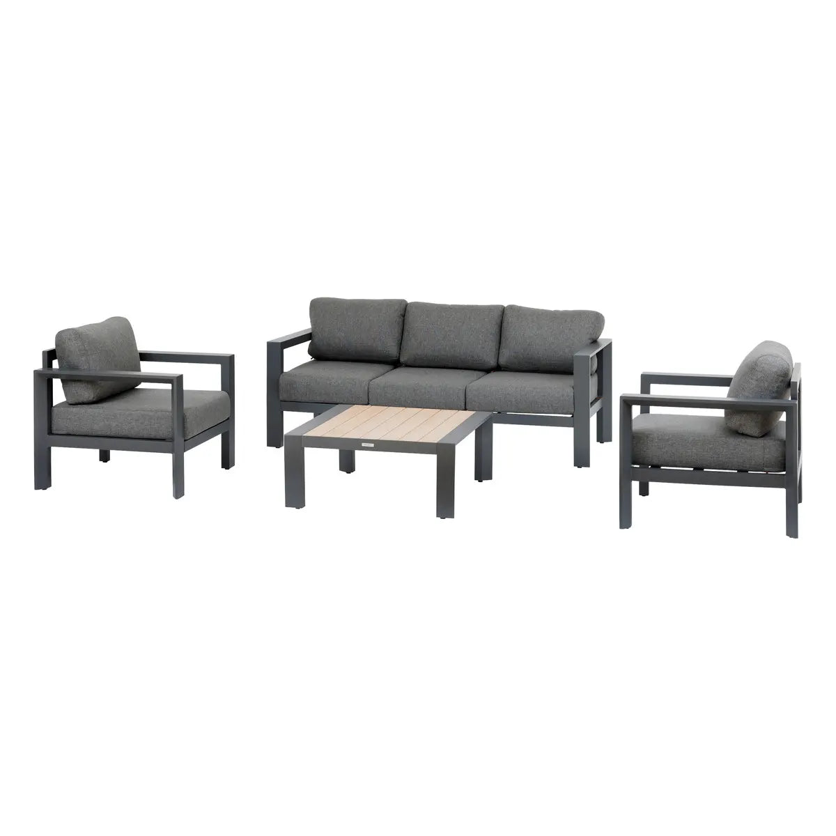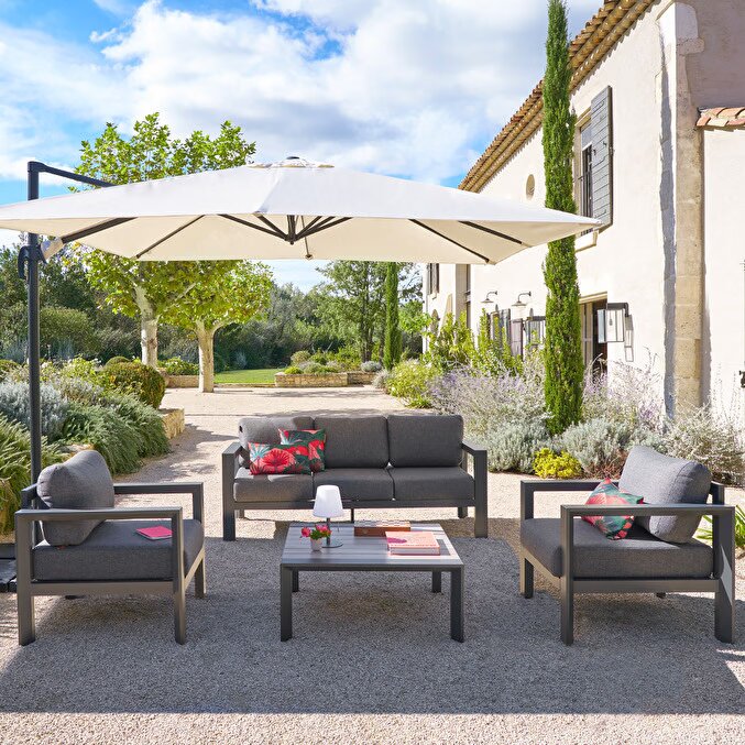 El conjunto "ÉVASION" incluye un sofá de 3 plazas, dos sillones y una mesa de centro, ofreciendo así 5 asientos cómodos. Los asientos están equipados con cojines gruesos recubiertos de una tela repelente al agua y el conjunto cuenta con patas ajustables para garantizar una estabilidad perfecta. ¡El conjunto ideal para recibir a familia y amigos!