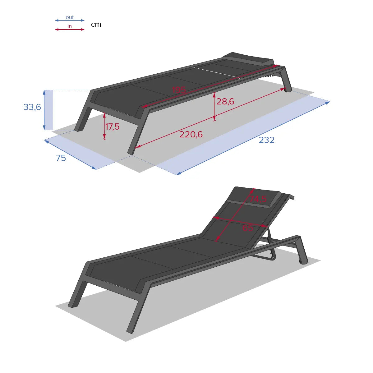 Sus dimensiones de 231 x 75 x 90 cm la hacen una tumbona ideal para descansar cómodamente, sin sentir que el espacio es demasiado justo. Su suave fibra acolchada y el reposacabezas te darán la máxima comodidad.