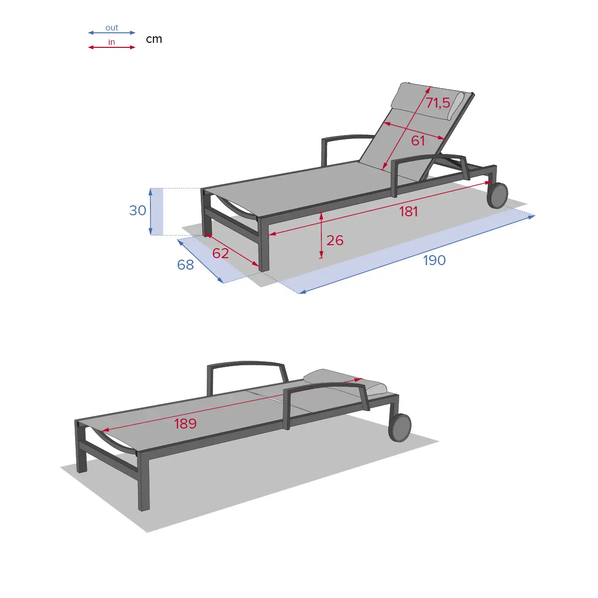 Esta tumbona de exteriores está elaborada en aluminio. La cubierta de texalina 610 g/m2, un tejido de poliéster trenzado recubierto de PVC, aporta flexibilidad y comodidad.